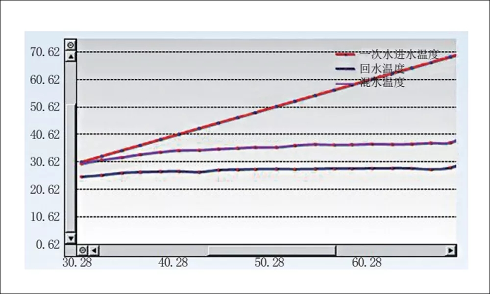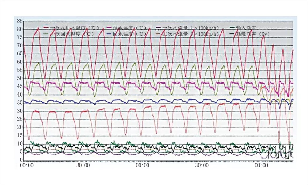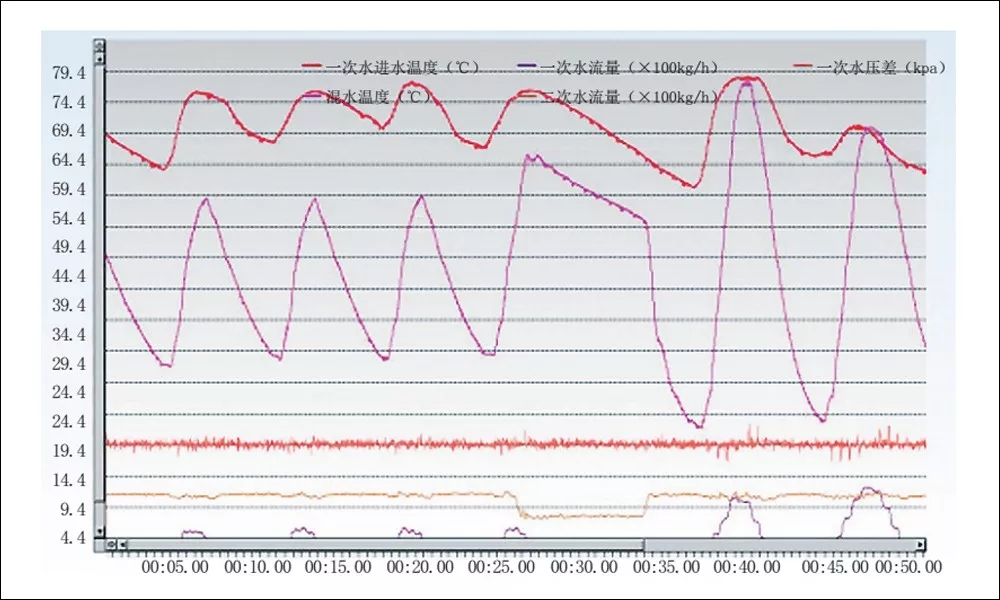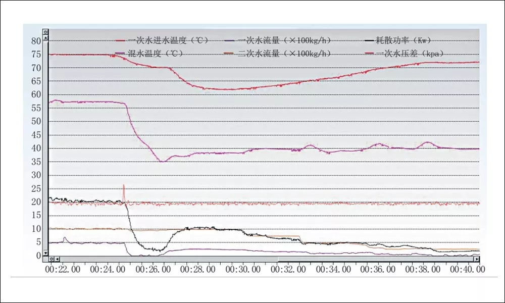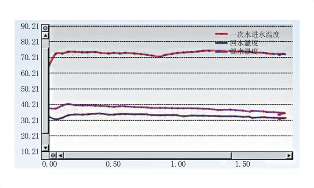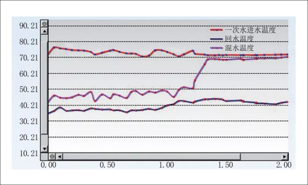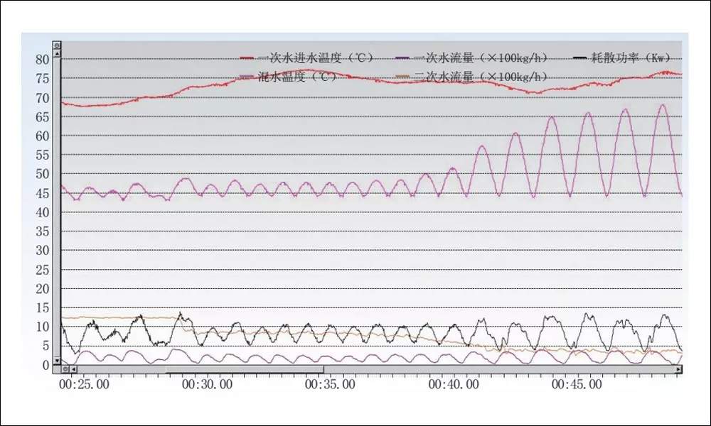 如圖1所示,這臺混水裝置的水溫穩(wěn)定性很好,當(dāng)上面第一條一次水溫在基本穩(wěn)定的情況下,混水裝置的出水溫度不論設(shè)定在多少度都能保持穩(wěn)定,波動范圍小于±1℃。