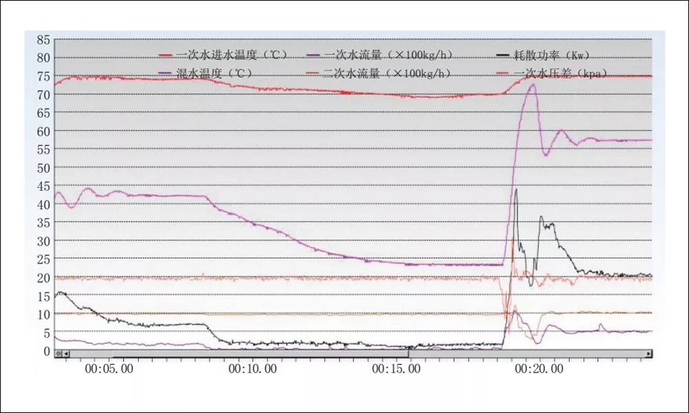 負(fù)荷適應(yīng)性參看圖6,無論負(fù)荷在20kW、10kW、5kW還是2kW,混水裝置的出水溫度都能保持穩(wěn)定。
