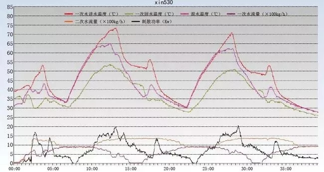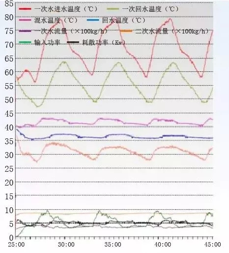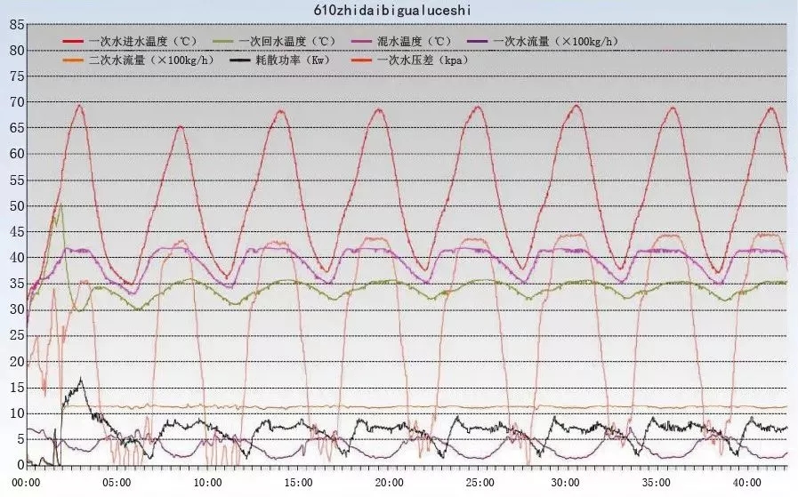上圖是常規(guī)壁掛爐配合壁掛爐專用混水裝置的工況測試圖,從圖中可以看出,壁掛爐的出水溫度在70℃~80℃之間波動,混水溫度45℃左右,回水溫度50℃~63℃之間波動,一次流量500kg,二次流量1000kg,這是符合相關(guān)需求的。