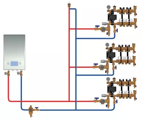 如果地暖面積較大,比如客戶是三層別墅,每層100m2,建議每層配置一臺壁掛爐專用混水裝置和一臺無線溫控器,無線溫控器控制本層混水裝置的水泵,并通過中央控制器聯(lián)動壁掛爐,任何一層需要采暖的時候給水泵供電即可,當(dāng)所有樓層都不需要采暖時聯(lián)動關(guān)閉壁掛爐。