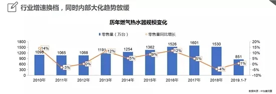 每年國內(nèi)燃氣熱水器銷量1600萬臺左右,但最近幾年基本處于停滯狀態(tài),從2016年1526萬臺到2018年1530萬臺、2019年前七個月851萬臺,幾乎沒有增長,似乎用戶對熱水的需求進入飽和,行業(yè)老化市場面臨天花板。