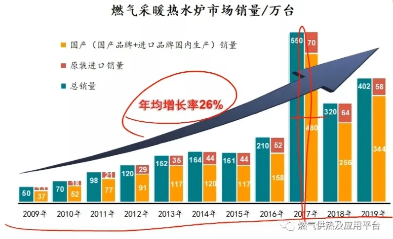 從上面的途中可以看到燃氣壁掛爐的銷量,從2016年的210萬臺,到2017年的550萬臺(煤改氣的影響),2018年的320萬臺,2019年的402萬臺,雖然受到煤改氣影響有所起伏,但整體還是向上的趨勢,從數(shù)量上已經(jīng)擁有400萬臺年銷量,是熱水器的四分之一。