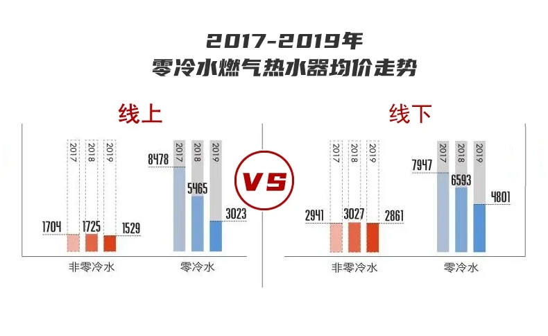 2、線上無論是非零冷水還是零冷水產(chǎn)品價格都要遠遠低于線下。2019年線下零冷水產(chǎn)品均價4801元,線上均價3023元,前者幾乎比后者高60%,通常情況下價格越低用戶越容易選擇,線上價格低應(yīng)該有更好的選擇概率。