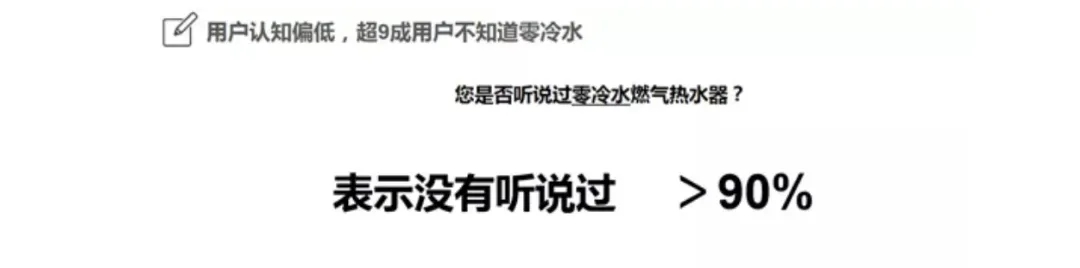 另一組數(shù)據(jù)佐證了這個推斷:針對普通消費者的調(diào)查顯示,90%以上的消費者是不了解零冷水熱水器產(chǎn)品,從來沒有聽說過的,只有5%的消費者知道或者在使用這個產(chǎn)品。