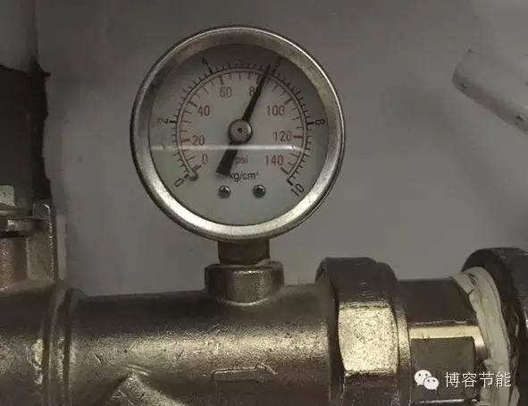 然后關(guān)閉進(jìn)進(jìn)水閥,通過末端放水泄壓到壓力表為0,然后開啟回水閥,記錄一個(gè)壓力值,這個(gè)值就是回水管道靜態(tài)壓力;下圖中管道進(jìn)水靜態(tài)壓力為5公斤;